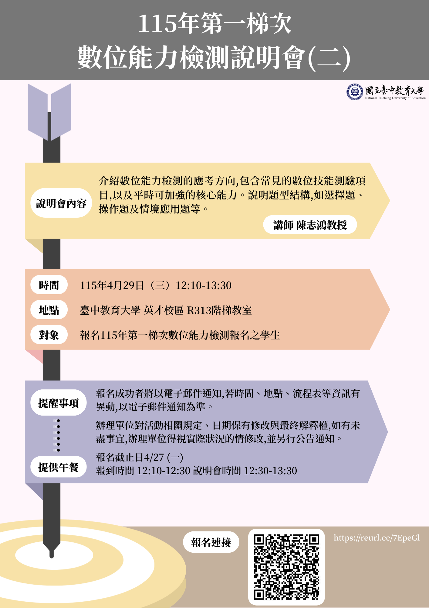 內容: 一、介紹數位能力檢測的應考方向,包含常見的數位技能測驗項目,以及平時可加強的核心能力。說明題型結構,如選擇題、操作題及情境應用題等。 二、檢測說明會共2場次: (一)第一場次: 1、日期:115年4月8日(星期三)。 2、時間:中午12時10分至13時30分。 3、地點:英才校區R313階梯教室。 4、報名網址:https://docs.google.com/forms/d/e/1FAIpQLSdxxUp6tMF2knot3FFa7DettM_n5TkWBMdwy20c4Igh8XBc4g/viewform?usp=header。 (二)第二場次: 1、日期:115年4月29日(星期三)。 2、時間:中午12時10分至13時30分。 3、地點:英才校區R313階梯教室。 4、報名網址:https://docs.google.com/forms/d/e/1FAIpQLSf5NnXdR2ofUwzHI4O1Hip6_CMtNCsEfaBIdl4wfAIqGoCL8g/viewform?usp=header。 三、本案聯絡人:智慧教育中心李小姐,電話:04-23696493;電子郵件:aiec@mail.ntcu.edu.tw。 四、檢附2場次活動海報各1份。